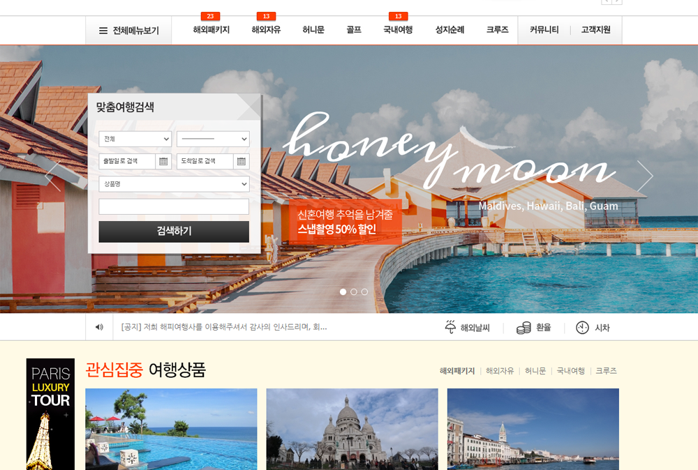 | 국내여행, 해외여행 등 다양한 여행상품을 소개하고 안내함은 물론, 실시간으로 여행상품을 예약할 수 있는 기능이 마련된 입점식 여행사 전문솔루션입니다.