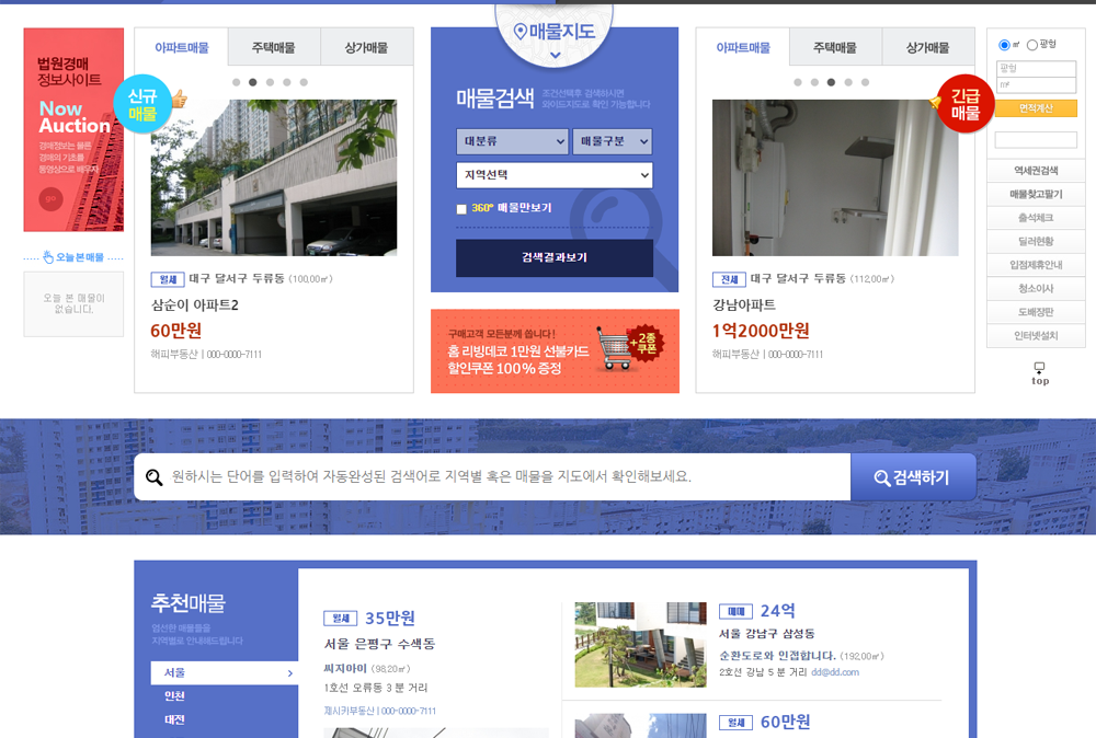 | 트랜디하게 더 넓어진 디자인으로 눈에 확들어오는 매물정보, 메인 매물지도기능, 다양한 매물검색기능, 각종 유료옵선 선택.관리기능, 딜러별 미니홈페이지 무한생성기능등 온라인 부동산 중개 사이트 운영에 최적화된 다양한 기능이 장착된 부동산와이드 중개 솔루션 입니다.